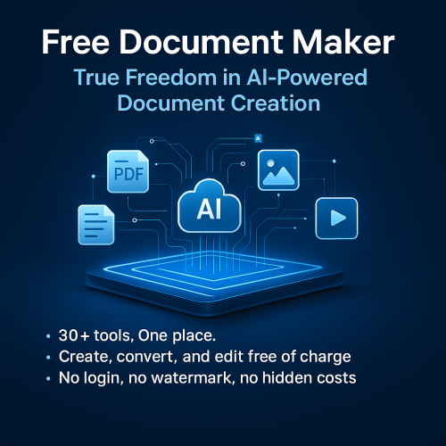 Founded by Saddam Hosen (SHSaad), AI Doc Suite is an AI-powered workspace developed under Free Document Maker — a company redefining document and media automation. Our mission is to make AI creation fast, free, and accessible for everyone. We build browser-based tools for documents, images, audio, and video — no login, no watermark, just instant productivity. AI Doc Suite — Smart AI Document Generator for a Faster Workflow Create reports, slides, and spreadsheets — edit with AI and export in one click. No signup. No watermark. Just speed.